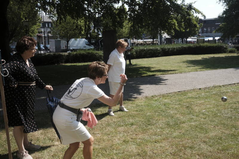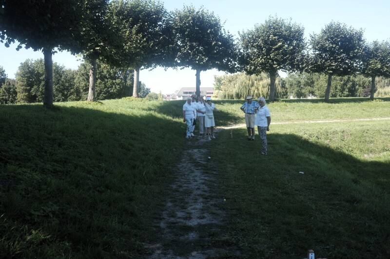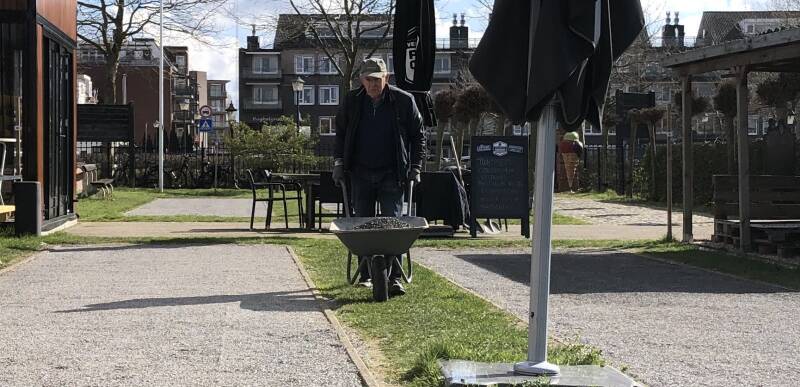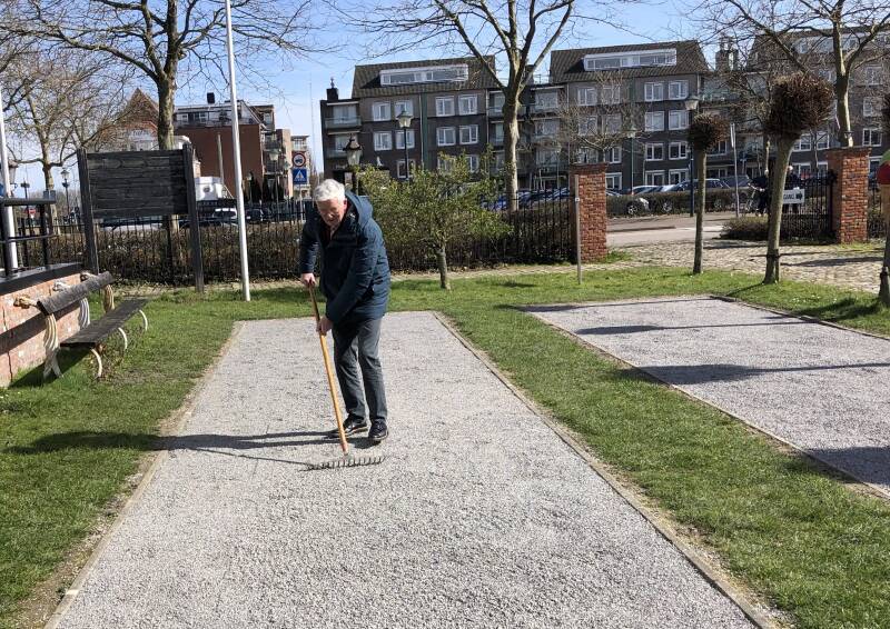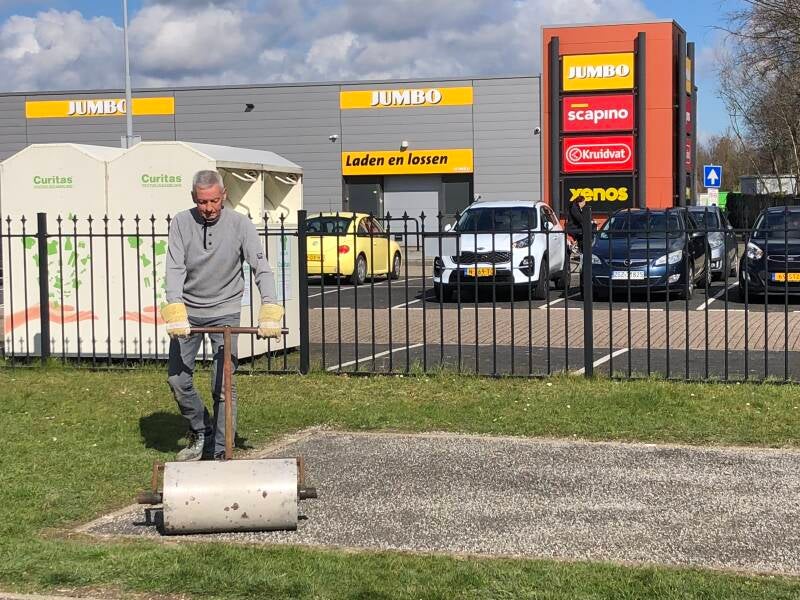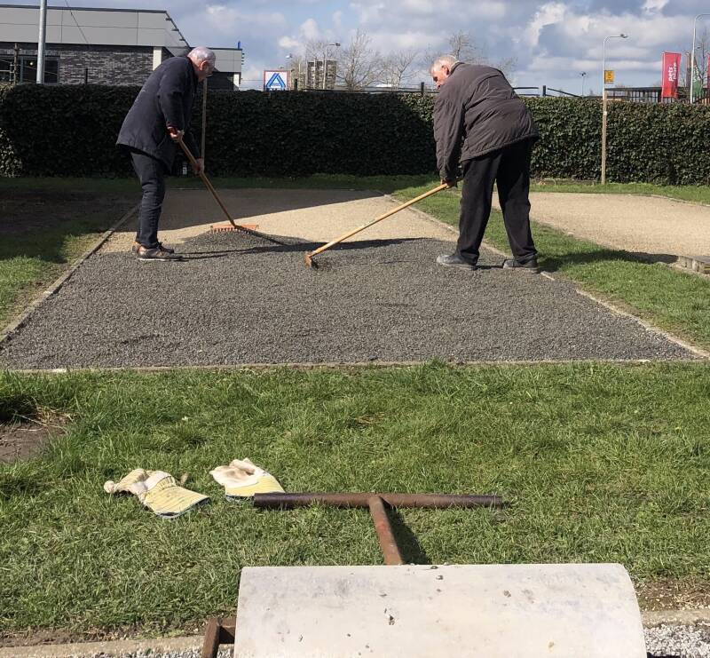 Werkzaamheden om op de pétanque banen een nieuw laagje Grit aan te brengen.